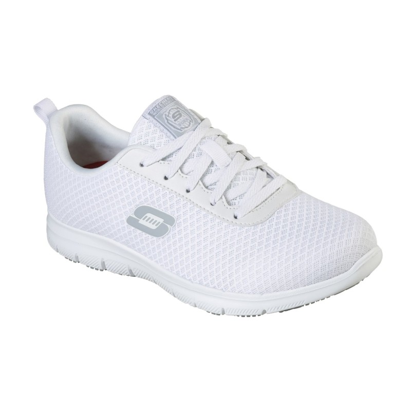 Skechers SK77210EC Ghenter Bronaugh Blanco Mujer. Resistente a hidrocarburos. • Suela antideslizante nivel "SRC" testada en baldosa y acero. • Diseño superior resistente al agua y a las manchas con protección Scotchgard®. • Superposición sintética lisa en los cordones para mayor durabilidad. • Zapatilla deportiva con cordones, antideslizante y confortable. • Malla de aire con textura duradera y capa inferior de rejilla. • Cordones en la parte delantera. • Panel de tela en el talón con lazo superior • Cuello y lengüeta acolchados. • Forro de tela suave. • Diseño Relaxed Fit® para un ajuste más amplio y cómodo. • Plantilla Memory Foam.