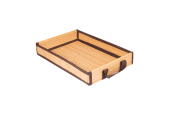 El bambú es un recurso altamente renovable, natural, duradero y muy ligero. La bandeja está fabricada con delgadas lamas de bambú y tienen un borde de tela para una mayor durabilidad. Permite transportar todo tipo de vajilla o elementos de mesa mediante las asas de las que dispone en cada extremo. Ofrece un estilo natural y tradicional. Los productos de bambú se presentan como una alternativa sostenible a los envases de plástico. Esta planta se caracteriza por su rápido crecimiento definiéndose como un material altamente renovable y, además, es totalmente biodegradable. Presenta una delicada y sutil apariencia que contrasta con su fuerte resistencia. Picks, palillos, cubiertos, boles, bandejas y muchas otras opciones para presentar todo tipo de alimentos.