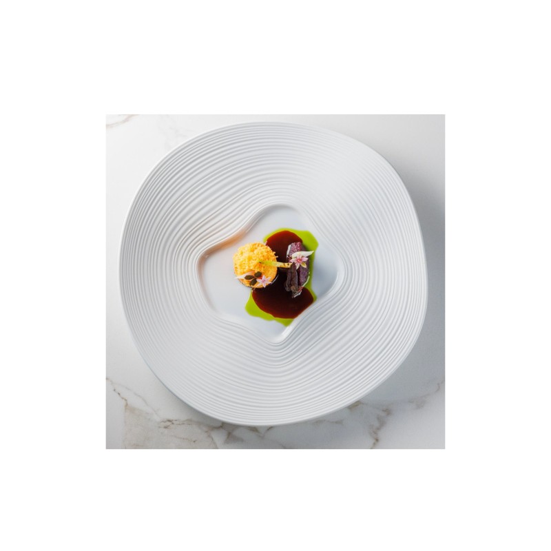 El entorno único de Noblessner, situado a orillas del mar Báltico, inspiró a Matthias a crear el plato "Noblessner Waves". La forma del plato imita las suaves olas visibles a través de las ventanas del restaurante, con un movimiento rítmico y relajante. La zona de servicio, de forma asimétrica y acristalada, está rodeada por un amplio borde en relieve con acabado mate, como una isla encantadora en un mar de inspiración.